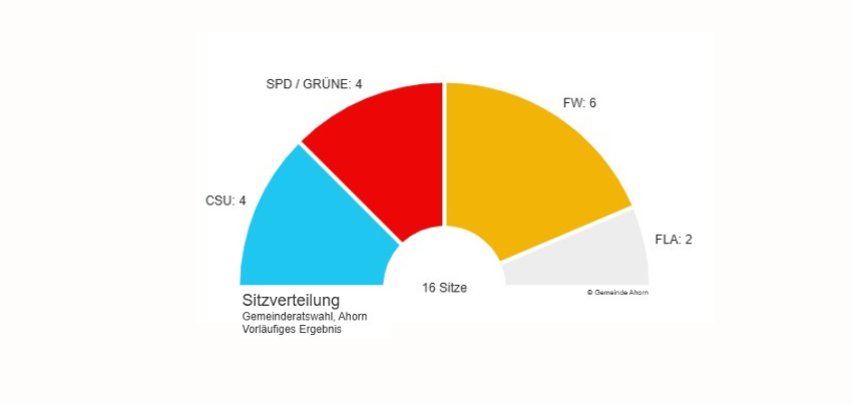 Auch das vorläufige Ergebnis der Gemeinderatswahl steht fest: Die Freien Wähler (FW) wurden mit 34,8 % der Stimmen stärkste Kraft und stellen künftig 6 Sitze im Gemeinderat. Dahinter folgen CSU mit 27,5 % und 4 Sitzen sowie SPD/Grüne mit 26,1 % und ebenfalls 4 Sitzen. Die Wählergemeinschaft Freie Liste Ahorn (FLA) kommt auf 11,5 % der Stimmen und erhält 2 Sitze im Gemeinderat.
