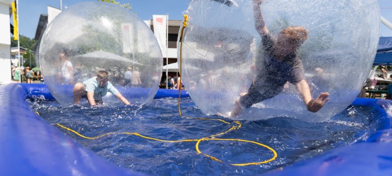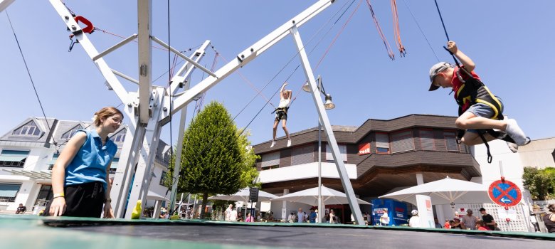 Parallel zum Rennspektakel wurde das Rathausumfeld zur großen Familienmeile: ein fröhlicher Familiennachmittag mit Spielstationen, kulinarischen Angeboten und kühler Erfrischung. Eine Schaumkanone, ein großes Bällebad, eine Hüpfburg und ein Trampolin ließen Kinderherzen höherschlagen – gesponsert unter anderem von der ThermeNatur und der Firma Weberpals.
