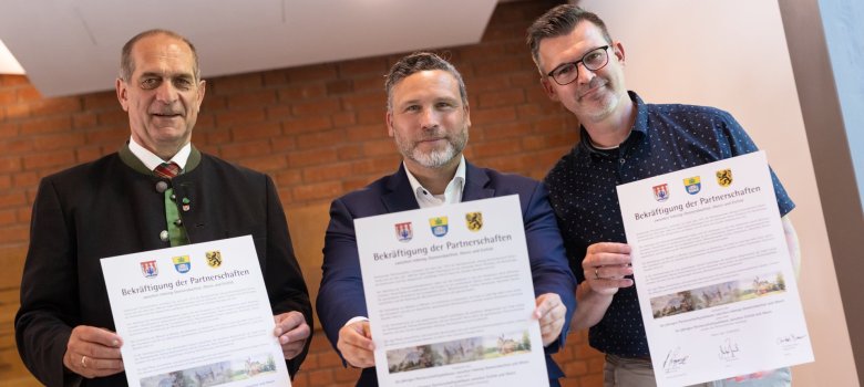 Im Zentrum des Abends stand die Erneuerung der Freundschaftsabkommen mit beiden Partnergemeinden. Gemeinsam mit seinen Amtskollegen Herbert Gugganig (Irdning-Donnersbachtal) und Christoph Bauer (Eisfeld) unterzeichnete Bürgermeister Finzel feierlich die Urkunden und betonte: